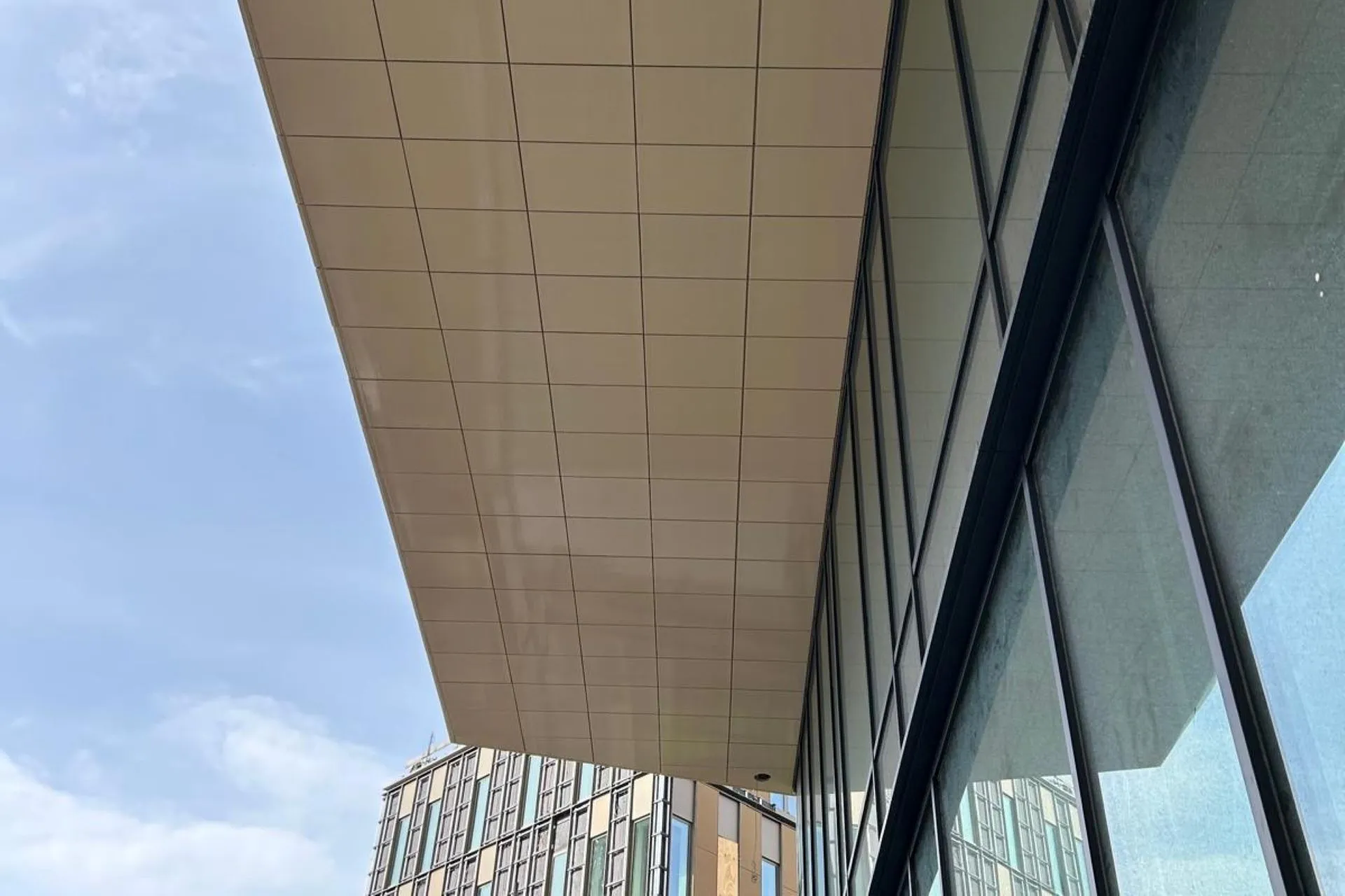 Daarnaast realiseert Sorba ook de keramische plafondbekleding op de eerste verdieping. Ook hier is gekozen voor een onzichtbare bevestiging, uitgevoerd op een aluminium onderconstructie en voorzien van isolatie. Daarmee loopt de materialisatie van buiten naar binnen logisch door.